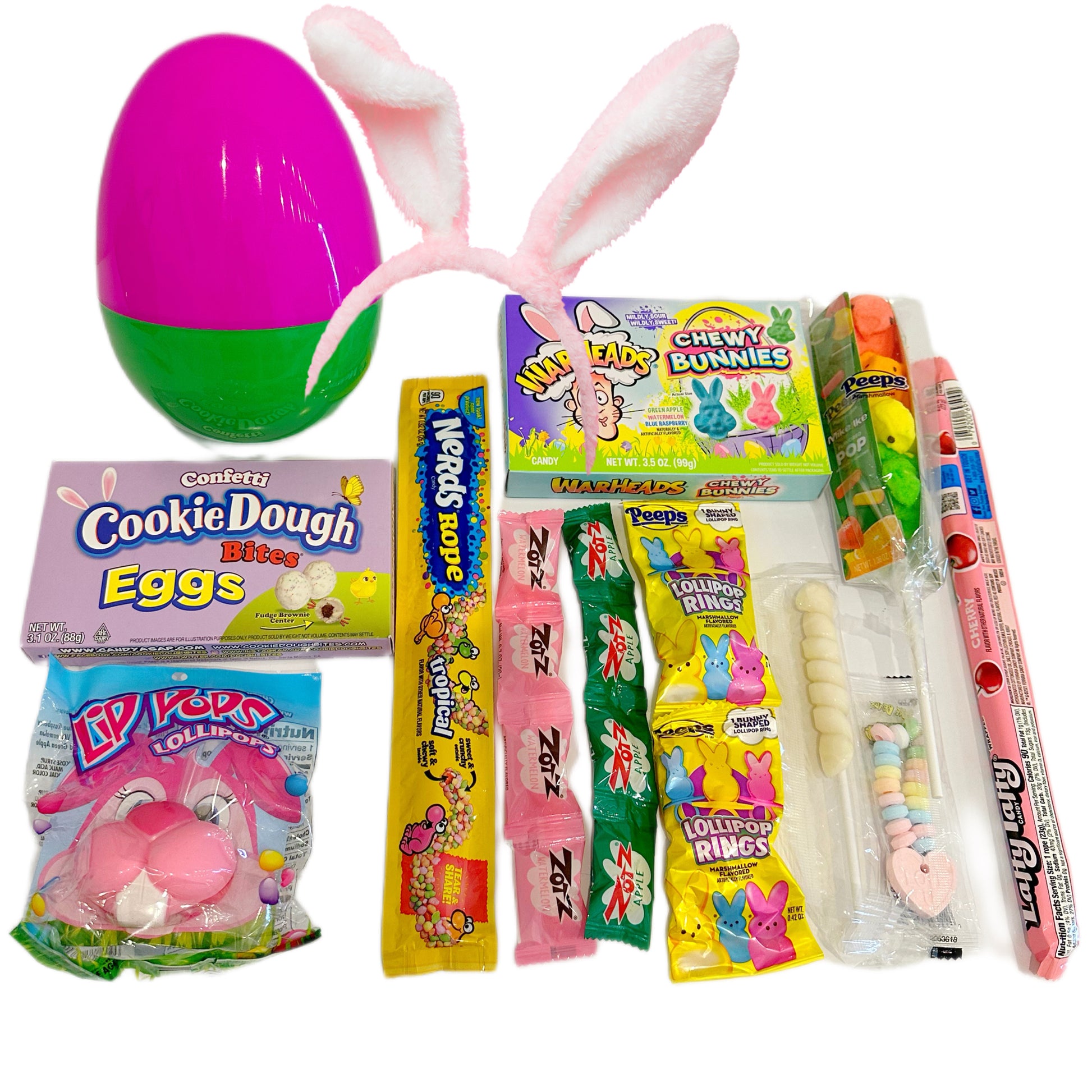 Let the OMG bunny do all the work! Surprise your sweeties with our Easter basket filled with a giant egg and the coolest candy including: laffy taffy, zots, easter ears, cookie dough eggs, war head sour gummy bunnies, peeps lollipop, vanilla lollipop, Mike and Ike stacked peeps, nerds rope and a candy bracelet or candy filled car. Easter bunny ears come in pink, blue and purple.